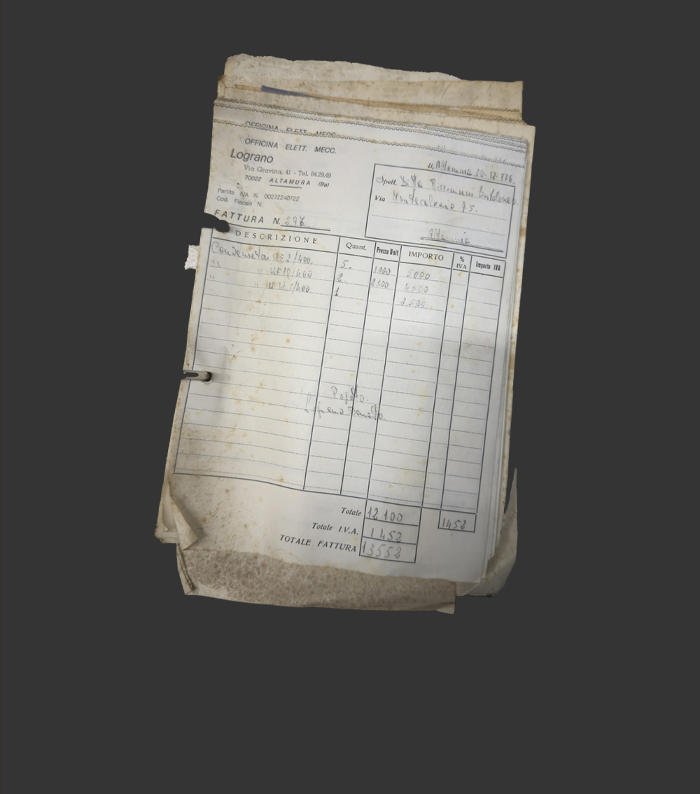 “Officina Elett. Mecc. Lograno” – Via Gravina 41, Altamura. Le fatture scritte a mano, i calcoli in lire, il timbro con la partita IVA. Tutto è iniziato così: un blocchetto, una penna e la competenza di chi sapeva riparare qualsiasi motore